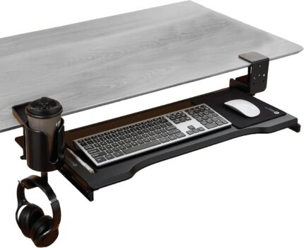 ErgoActive MDF Wooden Under Desk Keyboard Tray with Cup Holder, Clamp On Easy Install, Includes Mouse Pad, Ergonomic Wood Keyboard Tray for Office, Home, School and Gaming (Black)